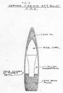 The envelope contains a lead tip, a hardened steel A.P. core which is tapered towards the rear 0.5 grains of yellow phosphorus and a lead base plug. The base of the A.P. core is seated in the base plug. The envelope has a small hole 0.013 in. in diameter just above the streamlined portion. The hole which is closed by fusible metal and is covered by the neck of the case provides the outlet for the phosphorus after firing. The base of the bul-let is soldered. |