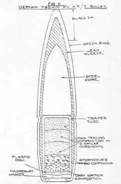 The envelope contains a hardened steel A.P. core and a tracer tube enclosed in a lead sleeve and is closed at the base by a magnesium washer under which the envelope is turned. The tracer tube is of steel and is coated on both sides with gliding metal. The tube contains a night tracing composition inserted in three concace pressings, a priming composition with coned finish and finally a dark ignition composition with a serrated finish. The ignition composition is covered by a pink plastic disc of polymerized oil. |