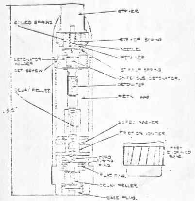 The bursting charge consists of 1.1 oz. of P.E.T.N./wax in a waxed card-board carton with a central cavity to receive the detonator with its container at the front end and the igniter delay pellet at the base end. A sorbo washer, under another washer, is positioned between the base of the bursting charge and the diaphragm formed in the body. |