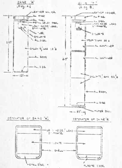 Brass gaines filled picric acid are shown in Pamphlet No. 1, Fig. 13, 14 and 16. Aluminium gaines filled P.E.T.N./Wax are shown in Pamphlet No. 4 Figs. 18 and 22. |