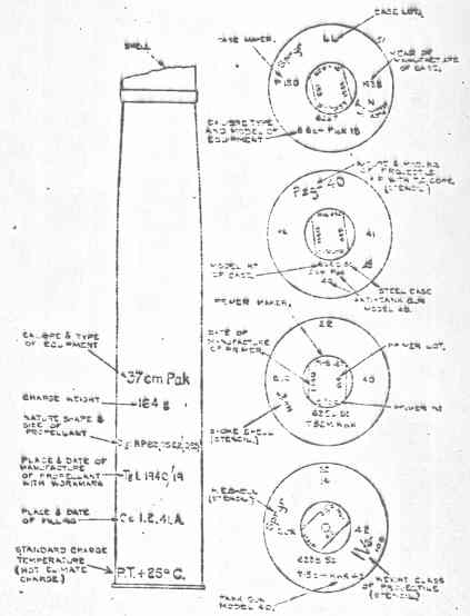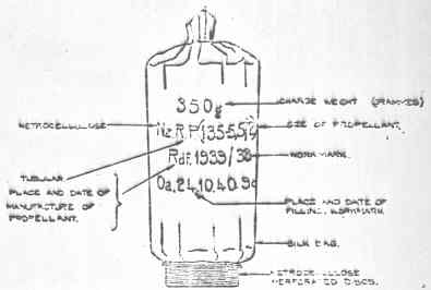The nature, shape and size of the propellant are stencilled below the marking indicating the charge weight. |
