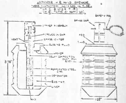 The cylindrical body of the grenade tapers near the base and head, is grooved for frag-mentation and contains a 2-oz. bursting charge of T.N.T. The striker, forming part of the igniter set, protrudes from the head of the body and is covered by a brass cap secured by a safety pin. The igniter set is of the time type with a delay of approximately 4.5 se-conds and is initiated by a blow immediately before throwing. The grenade is 3.78 inches in length, has a maximum diameter of 1.97 inches and has a filled weight of approximately 1 lb. The grenade is marked at the head with a red disc surrounded by a black circle. |