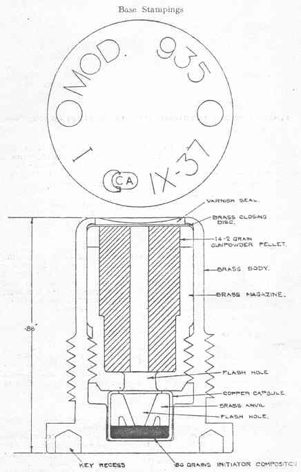The initiator capsule is of copper and contains a brass anvil with a conical flash-hole and 0.86 grain of initiator composition. The composition consists of mercury fulminate 31.9 per cent, potassium chlorate 32.4 per cent, antimony sulphide 32.6 per cent, and ground glass 8.1 per cent. The composition is protected by varnish, but there is no foil disc. |