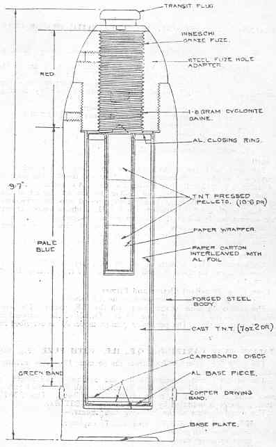 The complete round weighs 11 lb. and has an overall length of 15.4 inches. The shell is pale blue in colour, with a red head and a green band immediately in front of the driving band. The T.N.T. bursting charge is indicated by the stencilling "TRITOLO". |