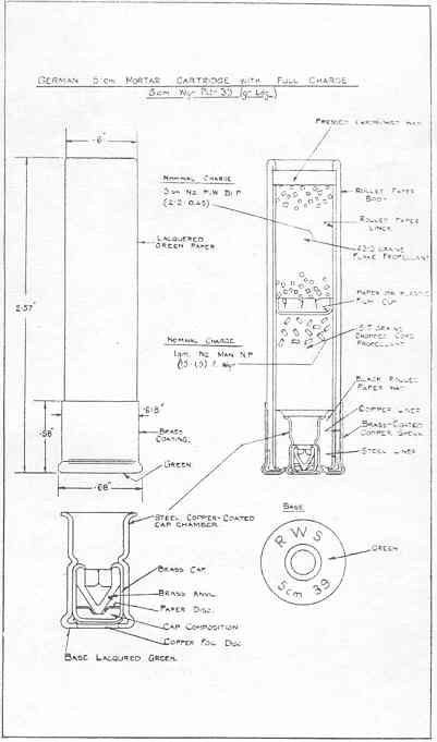 The cartridge is used with the H.E. bomb (5 cm Wgr. 36) described in Pamphlet No. 4 and is identified by the marking "5 cm 39" at the base. The base is lacquered green to indica-te the full charge. A similar cartridge with a reduced charge, the "5 cm Wgr.Patr. 38 (gr.Ldg.)" has a red base. |
