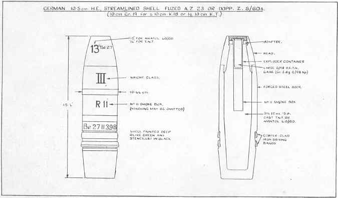GERMAN 10.5 cm, H.E. STREAMLINED SHELL FUZED A.Z. 23 OR DOPP.Z. S/60 s |