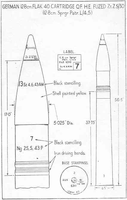 GERMAN 12,8 cm Flak 40 CARTRIDGE Q.F. H.E. FUZED Zt.Z. S/30 |