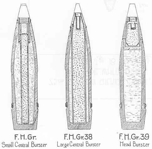 The number "38" or the letters "wKh" found on rocket and artillery projectiles refer to the large burster type. The number "39" refers to the head burster. The 15 cm shell, type 19, have small central bursters. The variation in burster types in artillery chemical shell therefore exists in both the 10.5 cm and 15 cm caliber; the following drawings illus-trate the burster types in 10.5 cm shell and the shell markings in the 7.5 cm, 10.5 cm and 15 cm calibers. |