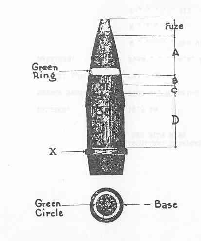 A scheme has been devised for the destignation of significant identification markings on artillery chemical ammunition by dividing the shell into six areas, namely: fuze, A, B, C, D and base. The areas designated by the letters "A" to "D" are not fixed because the stencilled markings on artillery shell have only approximate locations. The colored rings occasionally found just above the driving band (X) and at the top of section (A) are omitted because they have no chemical identification value; the latter ring and also the colored area around the filling plugs consist of detector paint. Markings on the base may be either stencilled with paint or attached in the form of a gummed label. |