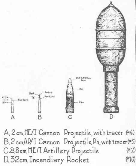 The "Ph" in the name of #3 and #5 refers to the WP filling in the ammunition. Number 9 is an incendiary rocket projectile filled with 11 gallons of a gasoline-oil mixture. All the other incendiary ammunition contains thermite for the incendiary constituent. The desig-nation AP/I indicates the dual function of the projectile, armor piercing and incendiary; HE/I, high explosive and incendiary. The projectile #7 is a flak shell and has a detachable ogive which is held on by only four threads. The shell contains 72 incendiary components which are ignited and ejec-ted into the air followed by the bursting of the shell case. |