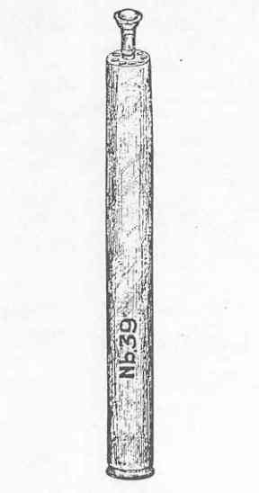 The tube is made of aluminum painted metal and measures 1 inch in diameter and 9.5 inches long. The green colored cardboard container holds 10 tubes and has a gummed label on the front reading: "10 Stück Rauchröhre Nb 39". The burning time of the tubes is about 1.5 minutes; the smoke mix-ture is a tightly packed fine powder consisting of HC. The tubes are set off with the standard smoke starter cylinder and pull igniter. |