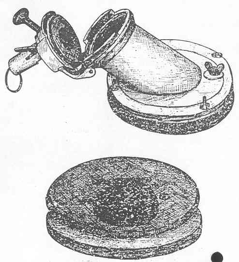 This model differs from the electrical model, item I–K–8 in that it can be loaded from the inside of the AFV and can be rotated through a 360 degrees traverse. The projector barrel is mounted on a circular plate which rotates in the ring mount. The drawing on the opposite page shows the firing face of the projector which is flush with the top of the AFV, the projector tube being inside the vehicle. The barrel measures 7.5 inches in length and 3.7 inches in diameter and is inclined at an angle of 60 degrees. The breech block which houses the spring loaded striker is opened by rotating through 90 degrees. |