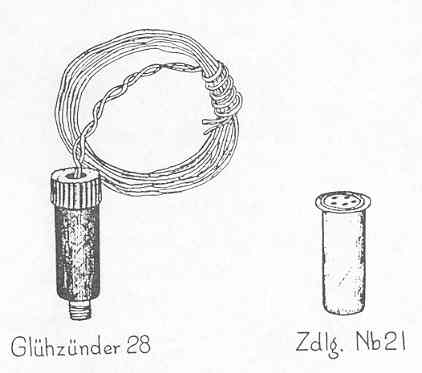 The electrical igniter exists in two forms: the instantaneous form, "Glühzünder 28", and the delay form "Glühzünder mit Verzögerung". They are made of thin aluminum and black plastic and are fitted with a pair of 36 inch plastic insulated wires; they measure 2.2 inches in length and 0.6 inches in diameter, and the aluminum end is thraded to fit the standard site igniter socket. The delay form of this igniter may have a delay time as high as 10 seconds; there are five different delay periods. |