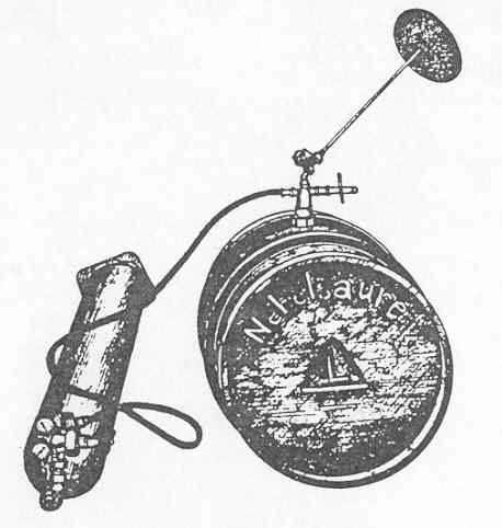 In operation, the barrel of smoke acid rests on the ground horizontally with the open-ing in the center facing upwards. The acid syphon is screwed into this opening and the 4 font spray tube is connected; the spray end of the latter is fitted with a circular metal disc. The compressed air cylinder is connected to the syphon tube through a pressure reducing valve and a rubber hose. |