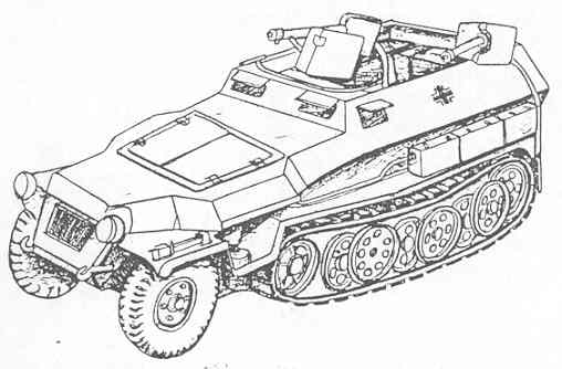 The vehicle is the same as the Sd.Kfz. 251 used for rocket projector (item I–M–1), and has two flamethrowers, one on each side, protected by "V" shaped armor plate. The flamethrowers are the same as the type used on trailers, item I–P–14. |