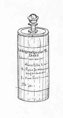 The container is a yellow painted aluminum cylinder measuring 1.8 inches in diameter and 3.7 inches high. In the center of one end is fitted the standard pull igniter. The gum-med label on the body of the cylinder gives the directions for use besides the above Ger-man name. The signal produces a cloud of yellow smoke for three minutes. |