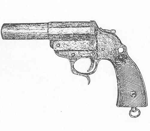 This pistol exists in 2 types, a lightweight model weighing 1 pound 9 ounces and the heavier model, weighing 2 pounds 2 ounces. The lightweight pistol is a breach loading signal pistol of the conventional style with a smooth bore, 6 inches long. The overall length of the pistol is 9.3 inches. It breaks at the base of the barrel for loading purposes. |