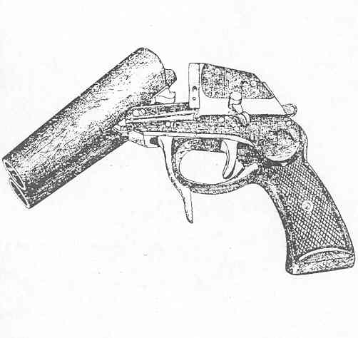This double-barrelled pistol is made of an aluminum alloy and weights 2.7 pounds. The overall length of this pistol is 11 inches; the barrels are 6.5 inches long. The pistol is "broken" by means of a lever situated at the front of the trigger guard and operation of this lever also cocks the hammers. This lever enables either barrel or both to be fired at will according to its position (the central position allowing the discharge of both simulta-neously). This pistol was originally issued to the German Air Forces. |