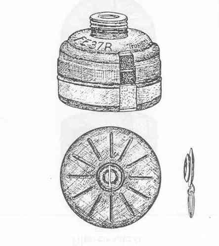 This class of canisters included all those stenciled "FE 37" and either "Tropen" or "Tp". The weight of the canister, less sealing plug and cap, is stenciled on the base in three figures. A brown ring, 0.6 inches wide, is usually found around the circumference of the canister just above the base. Numerous other markings, both goverment and manufac-turers', are also present. |