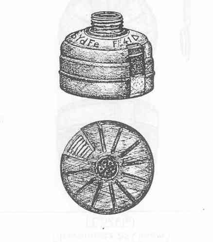 The canisters are of the snout-type, and made of green lacquered tin-plate, measur-ing 4.2 inches in diameter and 3.6 inches in height. The canister body is built from two sections of metal; the upper section consists of the externally threaded neck and all of the sides of the canister down to the base, and the second section consists of the rib-bed-domed base with single orifice and about 0.8 inches of the sides which overlap that portion of the first section which reaches to the base. The inlet orifice in the base is sealed with a removable metal plug, and the outlet at the neck is closed with a metal screw cap. |
