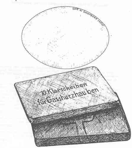 The metal box container for the sheets is marked "Klarscheiben für Gasschutzhauben". The word "Innenseite" is printed in black on the inside of the sheet at the top edge. |