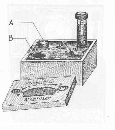The apparatus case is marked of the lid: "Prüfgerät für Atemfilter". Directions for use and manufacturers' markings may be found printed on a sheet of white paper glued on the inside of the case cover. |