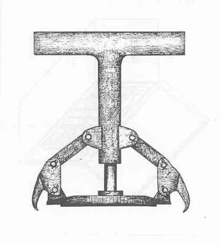 The instrument is made of black iron and fits securely on the eyepiece rim with the two crimping jaws, about 1/2 inch wide, on diametrically opposite sides. When the "T" handle is forced downward, two connecting levers close the jaws which in turn press down the edges of the eyepiece rim fastening it to the facepiece. The tool is rotated and the operation repeated until the entire eyepiece rim is secured to the facepiece with a gas tight fit. During the operation it is neccesary to support the inside rim of the eye-piece. |