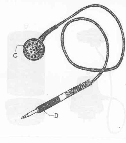 The microphone (C) is 1.3 inches in diameter and can be attached to the special out-let of the telephonic gas mask with a black metal adapter internally threaded. The micro-phone is fitted with a black connecting cord, 28 inches long, and a plug (D) which fits into the hand-microphone without affecting the use of the latter. |