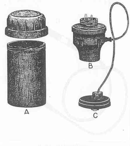 The container (A) consists of a black plastic cup with a screw cap of similar material. The overall dimensions of the cup are: height, 5.9 inches; diameter, 2.8 inches. The ex-ternal thread of the microphone (B) fits the nozzle of the standard German facepiece and the two wire prongs keep the inlet valve in the latter open. The bottom of the micro-phone proper is internally threaded to fit the standard German canister and just above the thread is a thin rubber semicircular valve which supplants the valve which is kept open in the nozzle of the facepiece. |