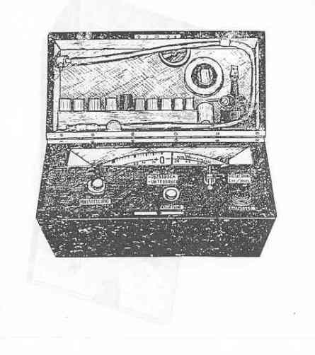 The scale is semi-circular in shape, the background being white and the numbers and letters black. The red pointer may be set at the zero point by means of the metal dial indicated as "NULLSTELLUNG". The red push button in the center of the panel is used for releasing the pressure in the apparatus preparatory to making a test. In the lower right corner of the panel there is a connecting fitting with a black screw cap; the marking just below this fitting "ANSCHLUSS". The apparatus is connected to the oxygen breathing the cover of the box. |