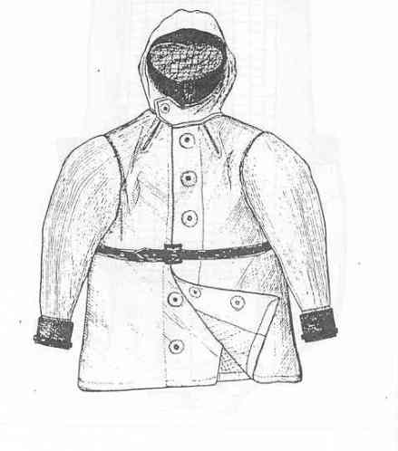 The jacket proper is made of gray-green rubber with fabric embedded in its center. There are some jackets similar to the above described type but without attached hoods. |