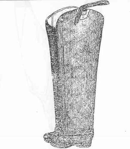 The boot is made of heavy black rubberized fabric. The size with the above marking has an overall length of 39 inches; the length of the slipper is 12 inches. The inside of the leg of the boot is cut away to fit the crotch. |