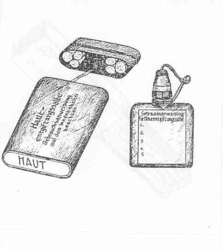 The fiber container is marked "Hautentgiftungssalbe" on the side and "HAUT" on each end. The label on the plastic flask is marked "Hautentgiftungssalbe (41)" and likewise the bottom of the flask except for the number "41". |