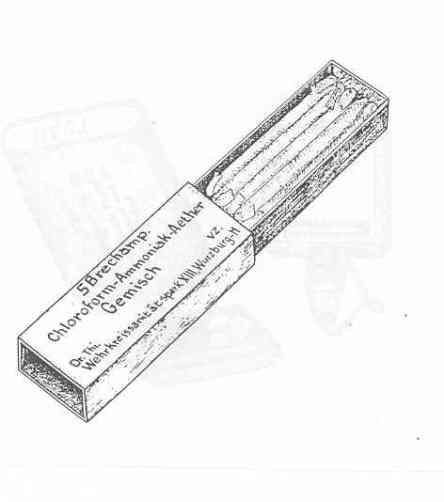The cardboard container measures 0.5 x 1 x 2.7 inches and is made similar to a match box. The packet contains five ampoules of colorless clear glass tubing covered with a braided sheath of white rayon. The ampoules are approximately 0.2 inches in diameter and two inches long. The filling consists of a colorless mixture of ammonia, chloroform, alcohol, and aether. |