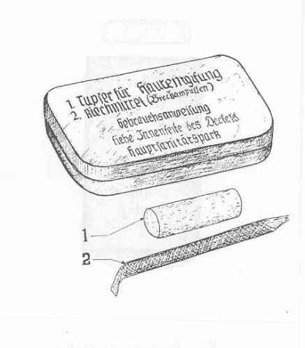 The cover of the tin container may be marked "Tupfer für Hautentgiftung" or "Tupfer für Hautentgiftung, Riechmittel (Brechampullen)". Directions for use are printed on the in-side of the lid. |