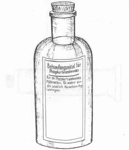 The label on the bottle is marked, "Behandlungsmittel für Phosphorbrandwunden", and also contains directions for use. |