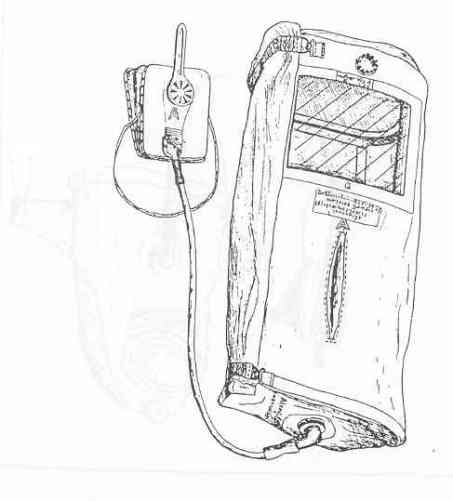 The crib fabric, bellows, hose, outlet and inlet valves are identical with those descri-bed under the child's protective jacket (III–Z–3). The outlet is on top of the crib just above the window and the inlet valve assembly is in the center of the foot-end. The in-side bottom of the crib is wooden, measuring 8.6 x 30 inches; the two inner wooden fra-mes on the ends have overall diemensions of 105 x 12 inches. The window on top is 8.5 inches long and 7.8 inches wide and is made of celluloid. |