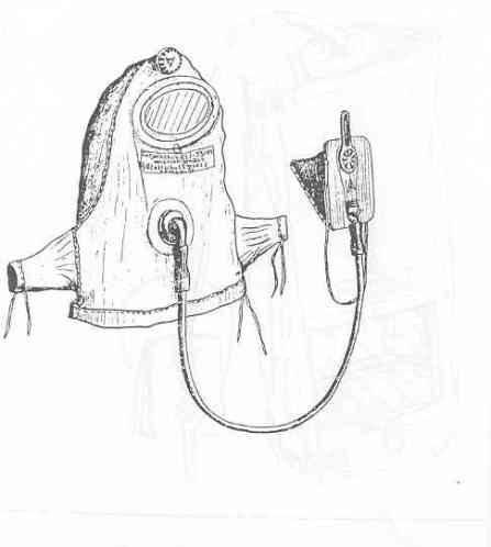The eyepiece consists of a elliptical convex celluloid window, 4.75 x 6.25 inches and cemented in the upper front of the jacket. The outlet valve is fitted into a 0.75 inch opening in the front of the jacket, 0.75 inches down from the topmost seam. The exter-nal guard case screws on the threaded part which fits into the opening from the inside and makes a tight fit against the jacket fabric. The guard case contains the outlet valve which is of the thin glass plate und coil spring type. The inlet valve consists of a rubber-zied fabric disc, 0.8 inches in diameter; the inside of the inlet assembly is made of black plastic and has an internal thread and rubber washer to receive the VM canister. The outside of the assembly consists of a black plastic elbow which is secured to the jacket by a metal band. |