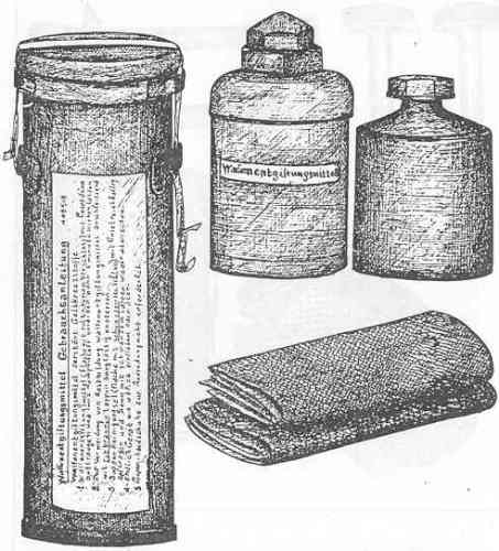 The flask of decontaminating liquid is enclosed in a loose protective fiber container, the cap of the flask projecting through an opening in the top of the container. The con-tainer is labeled "Waffenentgiftungsmittel". The flask itself may be made of heavy, clear glass or of red-brown plastic fitted with a red or brown plastic, hexagonal screw cap, and a platic-mounted bruen held in place in the neck of the bottle. The flask measures 8 inches high and 4 inches in diameter and contains a clear yellow solution having a strong chlorine odor. |
