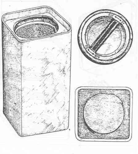 This shaker is similar to the metal model, item IV–A–7, except for the material out of which it is made. It is constructed of pressed brown cardboard coated inside and out with a brown varnish coating. It is rectangular in snape with rounded edges, measuring 8 x 8 x 14.5 inches. The cover is made of black plastic with a ribbed steel handle. The sha-ker is used in the same manner as the metal model but cannot be refilled. |