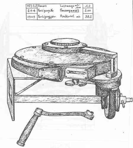 The nameplate contains the following markings: Luftmenge, m³/min, 1,2; Pressung mm WS, 200; Handkurbel min, 38.2. Both the top of the blower and the nameplate are mark-ed: HES 1,2. |