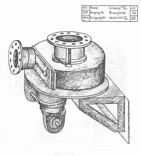 The nameplate contains the following markings: Luftmenge, m³/min, 10; Pressung mm WS, 50; Handkurbel U/min, 39. Both the top of the blower and the nameplate are mark-ed: HES 10. |