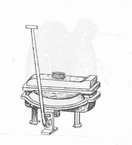 This is a manually operated double action bellows pump with a capacity of 2.4 cubic meters of air per minute. The pump rests on the floor, is 25 inches high and is 35 inches in diameter; the canisters are fitted on top of the pump. The operating handle which is at the side of the pump is 50 inches high and ??? a 24 inch crosspiece welded at the top; it operates a flexible diaphragm which forces the air through the system. The pump should be operated at 35 strockes per minuter to deliver its capacity. |