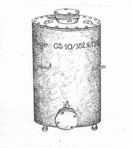 The canister is a cylindrical metal drum, olive-green in color and mounted on three stoel casters; the overall height is 51 inches and the overall diameter, 35.5 inches; the gross weight is 594 pounds. The cover of the canister is fitted with a rubber washer and bolted to the canister proper. |
