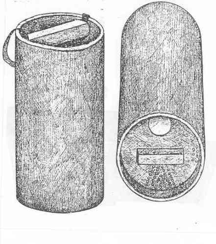 The detector powder shakers may be fiber cylinders painted dark brown or field gray and measuring 5.6 inches in diameter and 10.1 inches in height. The top and the shaker is recessed 3.6 inches and a wooden rod across this recess serves as the handle for the shaker. A cloth carrying tape is also fastened across the top end of the shaker. |