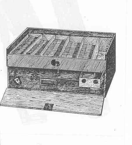 This is a wooden kit, painted gray-green and equipped with a canvas carrying strap on the sliding lid; it measures 8.7 x 9.1 x 16.3 inches. The sliding lid uncovers the top section of the kit which contains six compartments of 100 detector tubes each. The door for the bottom section is hinged at the bottom of the kit and is opened by a metal faste-ner which is held in position when the top lid is in place. This bottom section of the kit contains two receptacles for used detector tubes, the connecting hoses for the "Fest" detector set, replacement charcoal cartridges for the exhaust circuits of the set, rubber seats for the detector tubes and an electric cord for a power connection. |