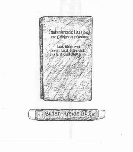 The box is marked: "Sudan-Kreide"; the label also gives the color changes with several agents. |