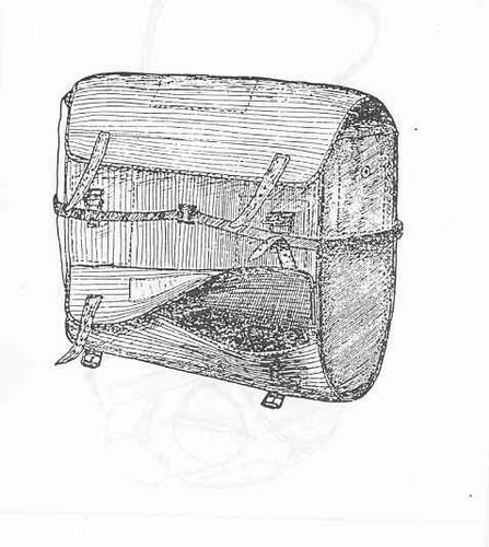 On the front of the flap covering and the lower compartment is a white cloth blank label, 2 x 4 inches. The carrier is fastened to the horse's harness by means of long black cloth straps which are connected to the carrier on both the back and front. |