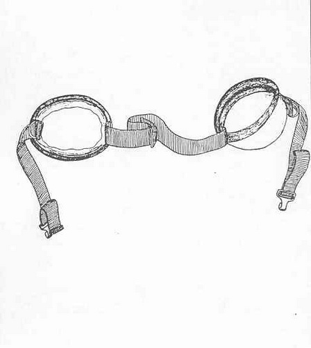 The goggles consist of a pair of convex eyepieces made of transparent plastic, joined by a gray, light cloth headstrap 0.8 inches wide, which is adjusted by means of a sliding buckle. The goggles are fitted with a side straps and hooks and eyes for fastening the goggle to the headharness. |