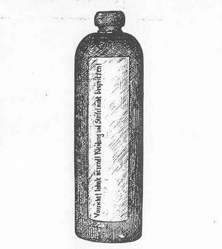 This dark brown liquid is contained in a brown stoneware crock 3.3 inches in diameter and 11.8 inches tall. The stopper in the neck is sealed with Plaster of Paris. A sprinkler metal insert tube is provided for despensing the lacrimatory liquid; it is fitted into the crock by means of a rubber stopper. The label refers to the sprinkler as a "Giesskopf". |